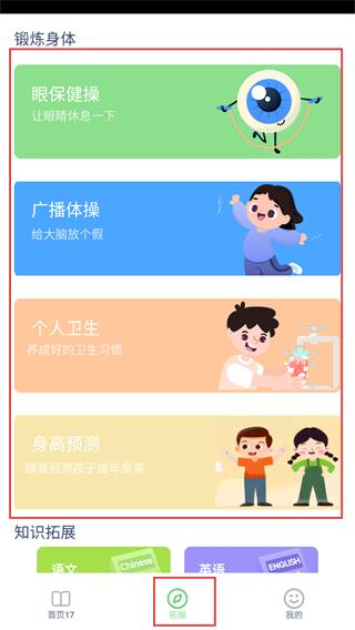 4、点击底部的【拓展-功能按钮】,进入拓展页面后,就能选择眼保健操之类的功能来使用了。