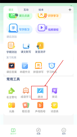 1、在首页的常用工具区域,点击【唐诗】功能按钮,即可进入唐诗列表页面。