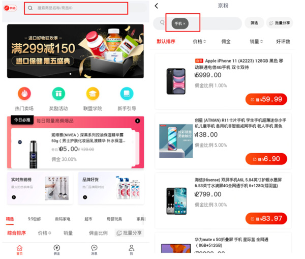 打开京粉APP,点击首页上方搜索框,输入想要分享商品的名称,选择要分享的商品,一键分享。