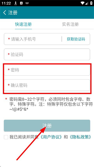 5、在设置并确认密码后勾选同意协议,点击注册按钮,即可完成账号注册流程。