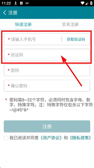 4、进入快速注册界面后,填写手机号码,接着点击“获取验证码”按钮并将收到的验证码输入进去。