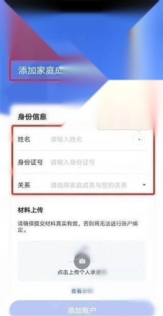 6、选定绑定方式后,可添加家庭成员,提交相关证明材料即可完成绑定操作。