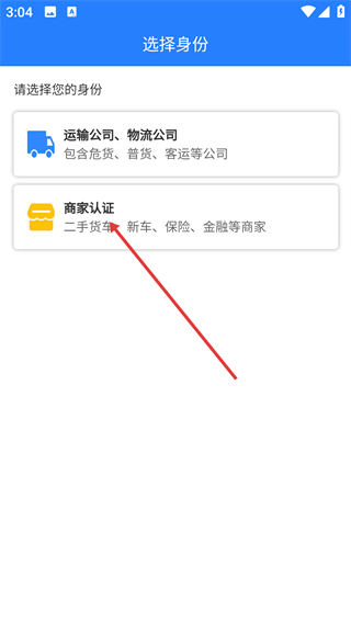 2、登录系统后跳转至身份选择界面,点击【商家认证】选项(此选项适用于二手货车、新车、保险等类型的商家),就能进入相应的认证环节。