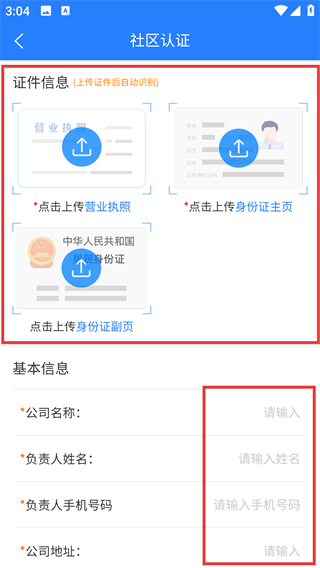 3、进入社区认证页面后,需先上传【营业执照】【身份证主页】【身份证副页】等相关证件信息,接着再填写【公司名称】【负责人姓名】等基础信息。