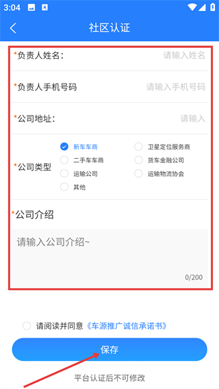 4、在完成证件与基本信息的填写操作后,需选择【公司类型】并填写【公司介绍】,接着勾选相关协议,最后点击【保存】按钮提交认证信息。