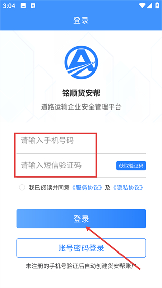 1、在【铭顺货安帮】的登录页面,先填写【请输入手机号码】这一栏,接着获取并填写【请输入短信验证码】,之后勾选相关协议,最后点击【登录】按钮,即可完成验证流程。