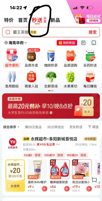 1、打开京东到家,在首页上,有着超市,外卖,品质生活,上门服务,摇一摇,优惠专区等等