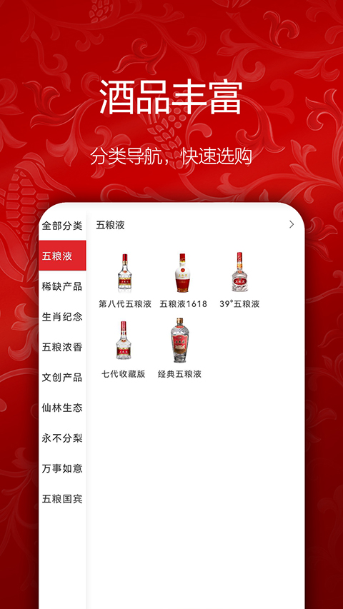 3、点击分类,大家可以看到各种度数年代的五粮液酒,自己喜欢的酒可以直接进行购买
