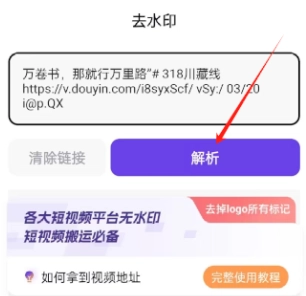 获取获取短视频链接,打开【抖快去水印】,在文本框粘贴短视频链接,点击【解析】