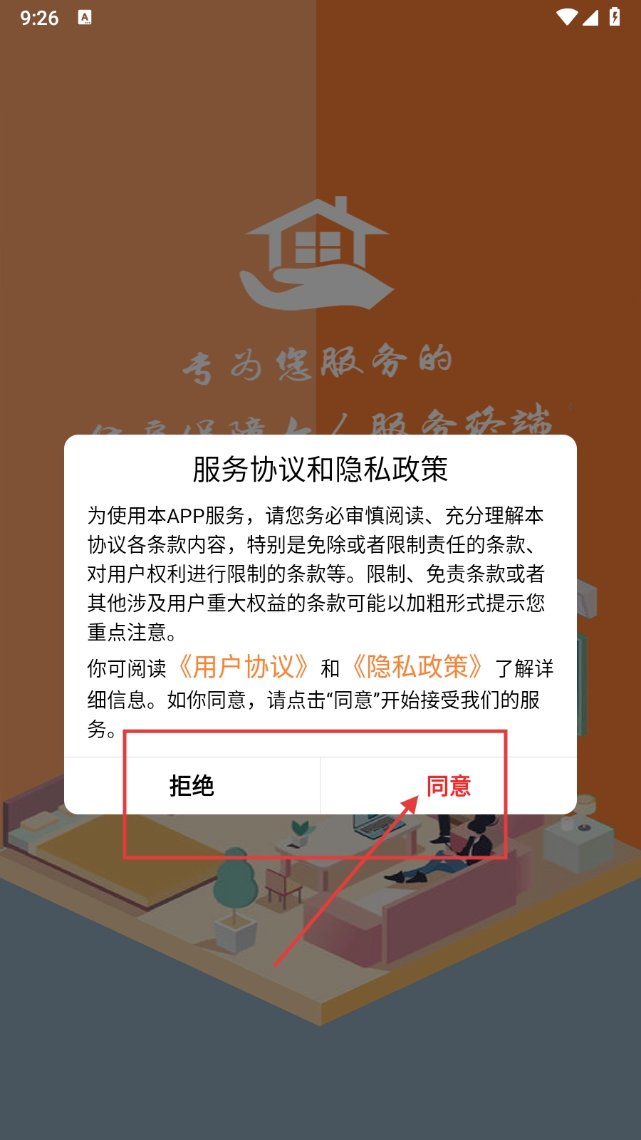 1、进入时会弹出【服务协议和隐私政策】提示框,点击同意,方可继续使用服务。