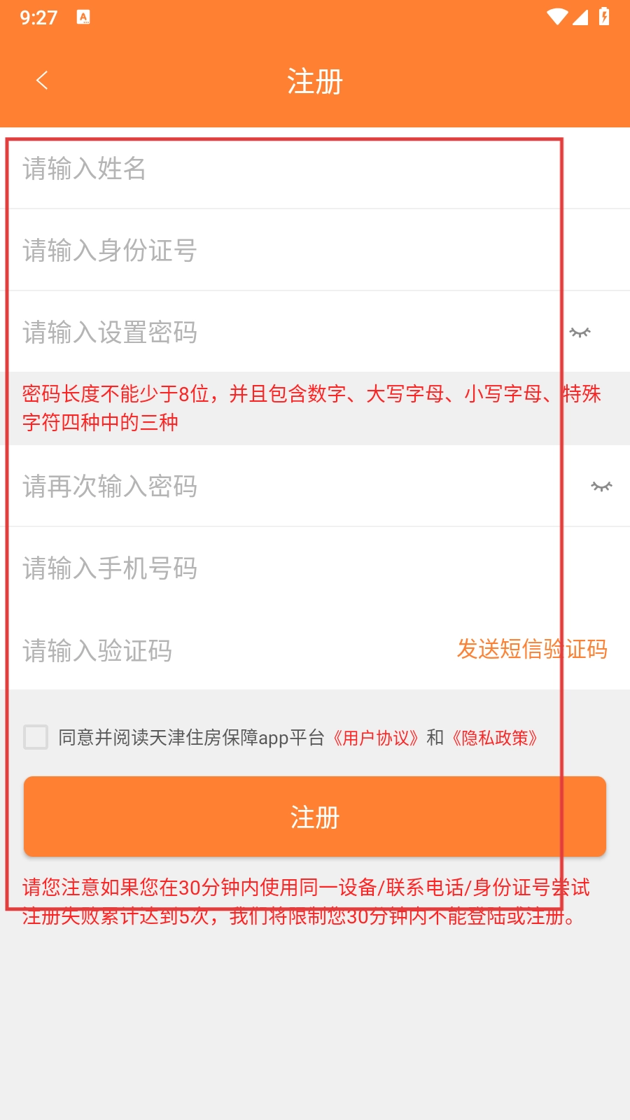 4、注册时需依次填写【姓名】【身份证号】【设置密码】等信息,填写完成并同意协议后点击【注册】即可完成账号注册。