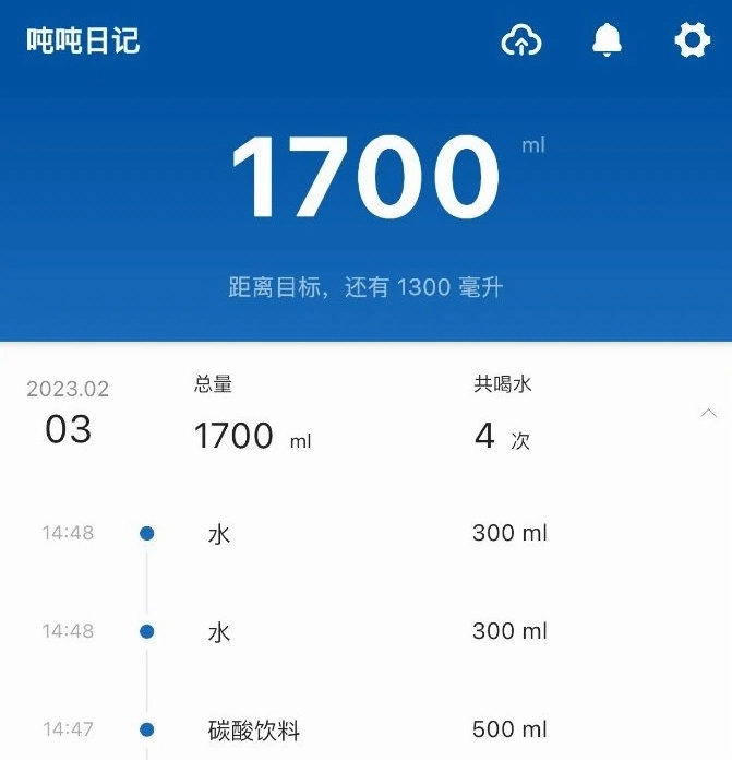 饮水记录:点击“吨一口”按钮记录每次饮水量,支持拍照识别杯型,自动换算容量。