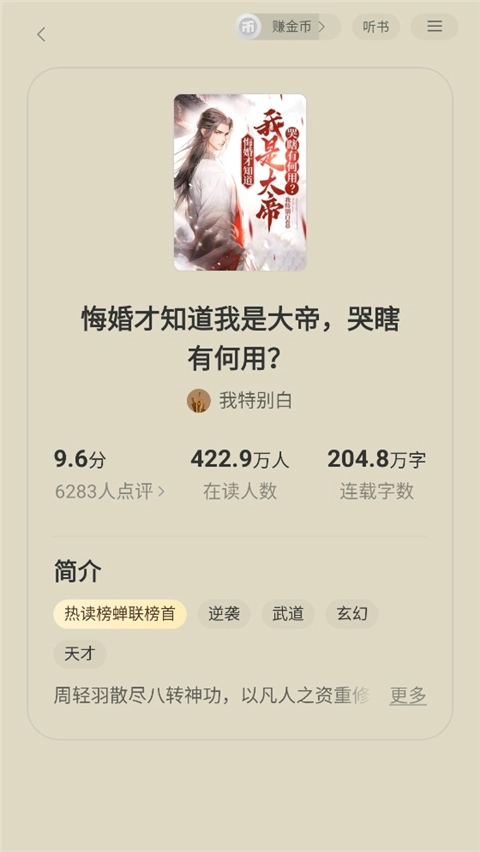 4、挑选好对应的书籍后,就能查看评分、在读人数、字数、简介等具体信息。