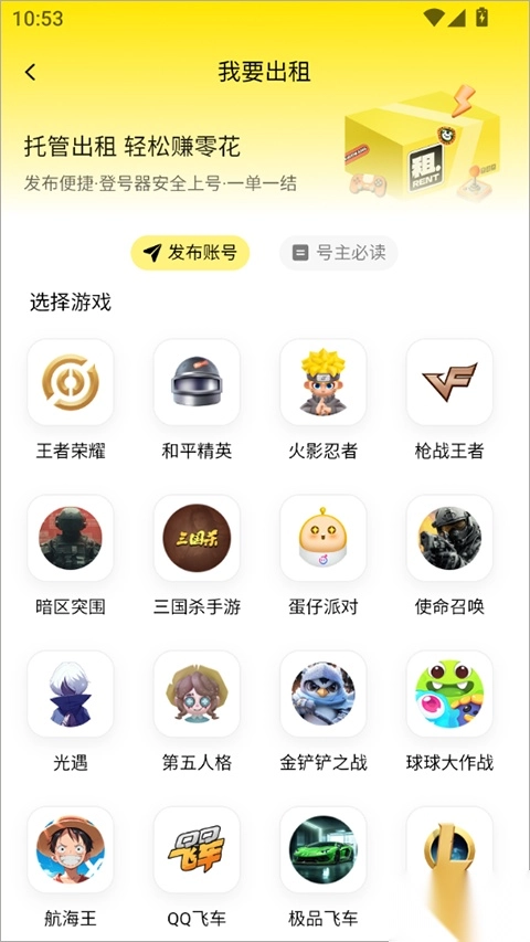 在出租信息发布界面,选定具体游戏后,按指引填写游戏账号与密码,就能完成托管信息的一键发布。像腾讯旗下的《王者荣耀》《和平精英》这类热门游戏,无需额外补充道具相关内容;不过《和平精英》的特效枪、《火影忍者》的通灵兽,以及部分VIP专属权益,需要手动录入信息。