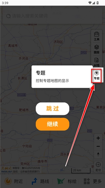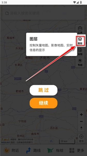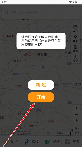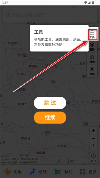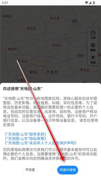 1.请下载安装天地图山东的最新版本并打开,进入后点击“同意并继续”按钮。
