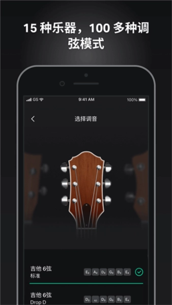 夹好后,使用guitartuna软件将第5弦调整为标准定弦的A调。