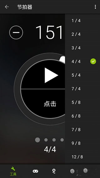 7、点击节拍器进入其界面,在此可对节拍器的速度与拍数进行设置,之后点击播放按钮,节拍器便会开始运行。