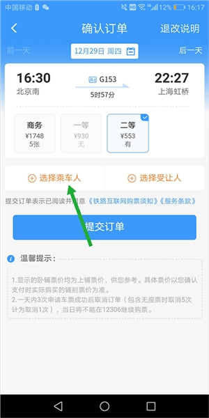 3、在打开的新页面中确认订单的同时点击【选择乘车人】