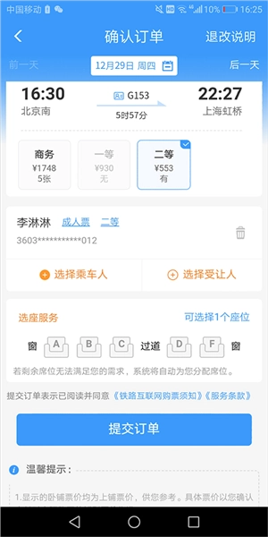6、选择好乘车人后,点击页面右上角的【完成】,返回到【确认订单】页面中,如需要在线选座可以在【选座服务】上进行座位选取,如果需要可直接点击【提交订单】进行支付即可