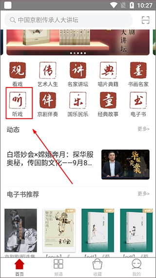 1、打开登录国韵传承,点击首页的【听戏】;