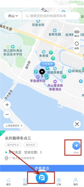 6、停车时点击中间P按钮,可以查看当前位置附近的停车场,还可以一键导航到指定停车场。