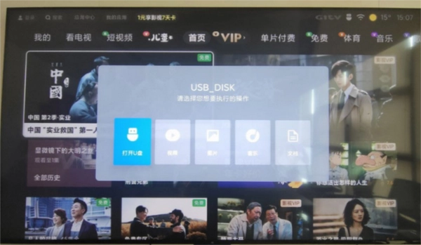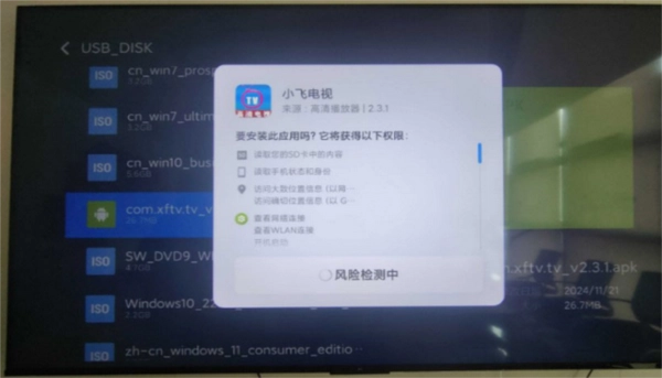 2、将好的小飞电视安装包的u盘插到电视usb接口上,会提示检测到新的usb设备,打开它。