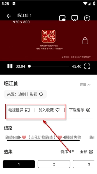4、在影片详情页点击“收藏”按钮(心形图标),收藏内容可在“我的”→“收藏”中查看。