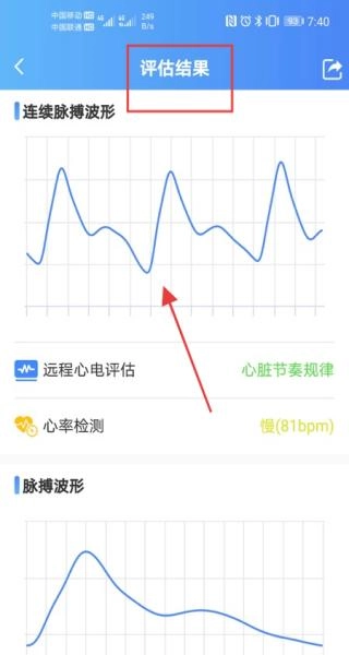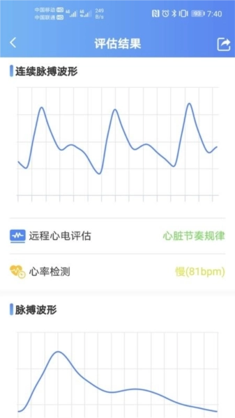 3、评估结果界面,会呈现连续脉搏波形等内容,同时涵盖远程心电评估、心率检测等相关信息,可用于对心脏节律等心脏健康状况进行分析。