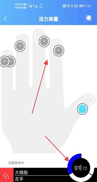1、可呈现的是活力测量界面,借助在手指部位添加标识等操作开展测量,界面显示电量查询中。
