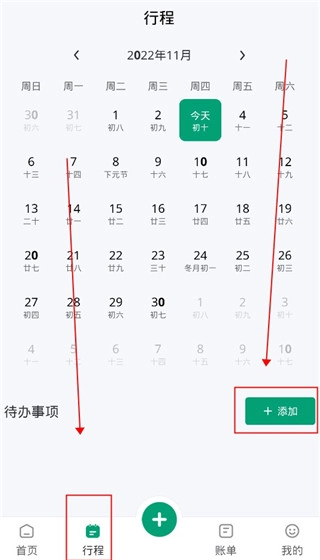 3、我们点击行程选项,接着在这里点击添加按钮,就能把后续重要事项记录进去,到了设定时间软件会自动提醒你。