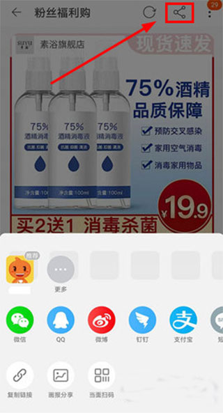 2、然后用户在商品的详细介绍界面选择点击上方的分享功能按钮就可以将商品链接分享给好友了。