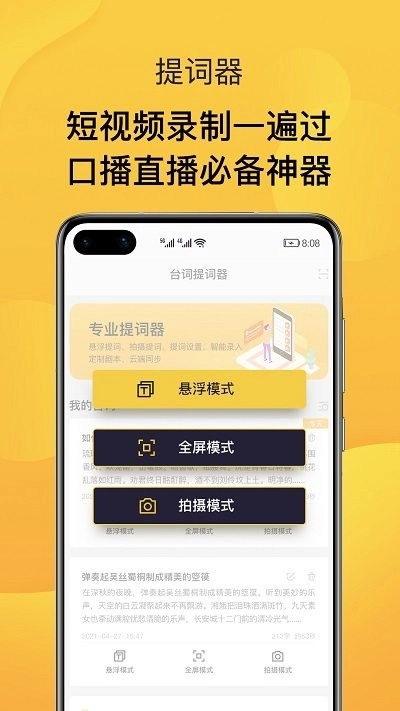 悬浮提词智能拍,搭配任意拍摄,告别多手机提词,无需购买昂贵提词设备。