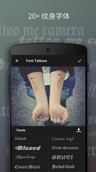 纹身相机是一款能让用户在线挑选最适配纹身、秒变纹身达人的软件。它完全免费,也不耗费任何时间,只需选好纹身样式和想纹的部位,就能轻松在身体各部位拍出逼真的纹身效果。软件里有海量男女艺术纹身、字体可供用户自由选择。