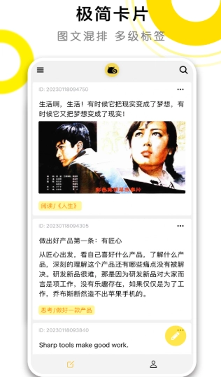 极简记录:采用聊天式卡片输入,支持图文混排,可像发送消息一样快速捕捉灵感、随笔或备忘。