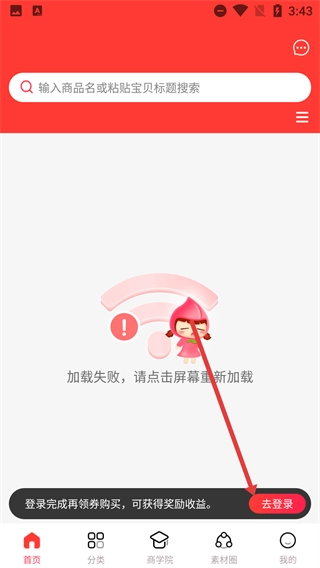 当主界面出现“加载失败”提示时,您可以点击屏幕尝试重新加载;若需要登录,也可通过点击底部的【去登录】按钮进入登录页面。