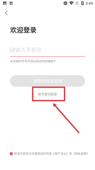 3、登录页面支持选择【账号密码登录】方式,若使用未注册的手机号进行验证,系统将自动创建账户,操作前需先勾选协议同意选项。
