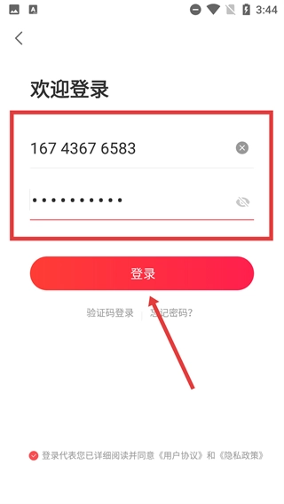 4、在账号密码登录页面输入【手机号】和【密码】后,点击红色的【登录】按钮,就能完成账号登录流程。