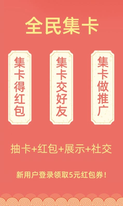 全民集卡是一款集抽卡、红包、展示和社交功能于一体的创新型安卓软件。用户可以在该平台中通过抽卡来收集卡片,完成一套卡片的收集后,可以进行合成,合成后即可获得现金红包或优惠券奖励。同时,用户或商家还可以在线发布集卡任务,自定义设置奖励,让其他用户参与集卡,从而实现推广和引流的目的。