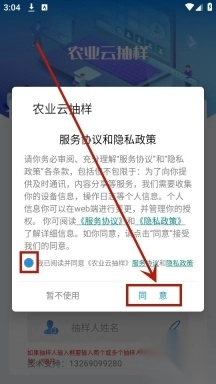 1. 安装并打开农业云抽样应用,勾选隐私政策相关选项后,点击【同意】按钮。