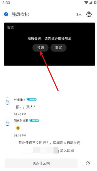 4、最后还能加入他人创建的房间一同观看,要是出现图中提示的播放失败情况,点击换源”切换播放源就能继续观看了。