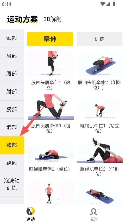 功能模块的划分清晰明确,主要包含运动规划与三维解剖这两大模块。在动作方案里,又进一步细分为拉伸和训练两部分,这样的结构设计既清晰明了,也便于用户操作。