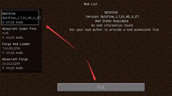 第八步:进入后可查看已安装的mod列表,随后点击完成”按钮。