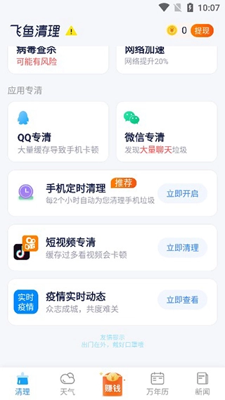 飞鱼清理大师是一款功能强大、十分好用的手机极速清理工具。它支持一键清理手机内各类垃圾文件与缓存文件,能针对应用缓存垃圾进行快速清理,还提供专清、QQ专清等多样化清理方式,全方位查杀手机缓存,为用户打造干净顺畅的手机使用体验。有需要的用户可在本站下载使用。