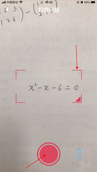 3、打开手机摄像头,把题目放到屏幕提示的区域里,接着点击下方的红色按钮;