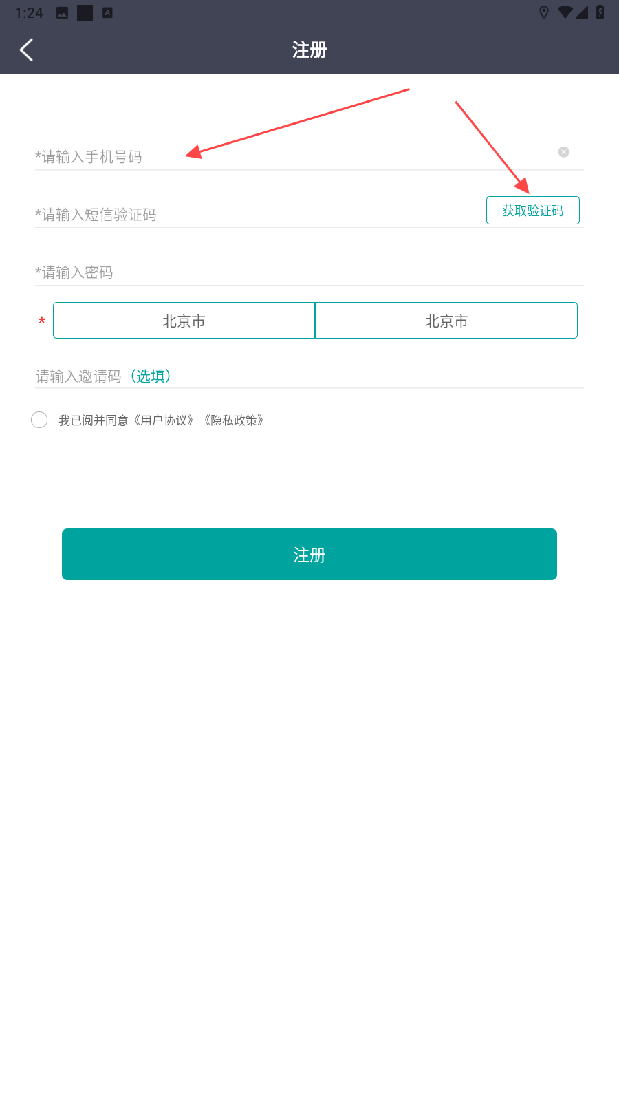 3、进入注册界面后,填写【手机号】并输入【验证码】,就能完成账号注册。