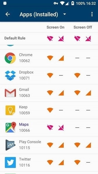 1、阻止每个应用的网络访问,基于屏幕的开/关,WiFi /移动(3G和4G)和漫游状态