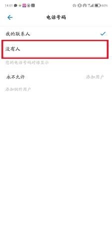 4、将没有人”勾选,确认后点击左上角的箭头返回,这样手机号就隐藏好了。