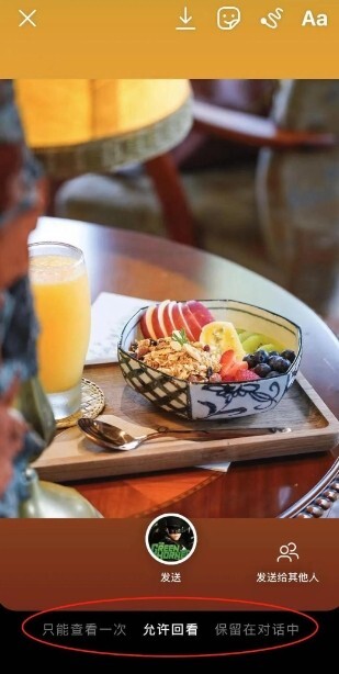 「允许回看」:可重复播放,对方能在消失前开启并回放照片或视频一次。