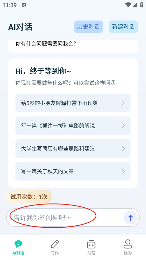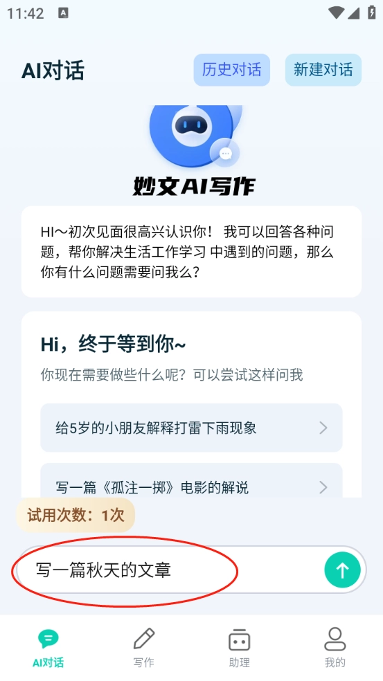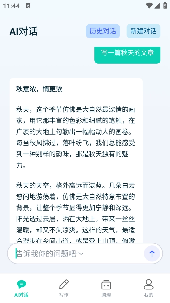 选择自己所需的功能点击进入,我选的是AI对话板块,输入的内容是“写一篇关于秋天的文章”。