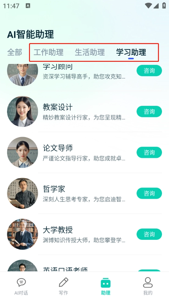 这里还有一个“AI智能助理”板块,能帮你解决工作、生活和学习等各方面的问题。